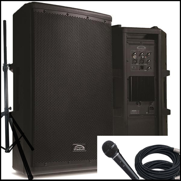 A single 15 inch, 500 watt powered speaker with Bluetooth connectivity, one speaker stand, one microphone stand, one microphone and cable. Inputs for microphones, RCA AUX cable, XLR Line input and Bluetooth with remote. Perfect for parties and conferences.