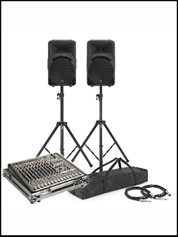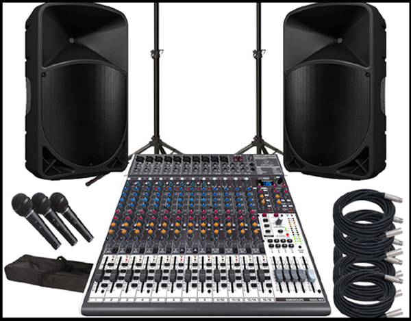 Behringer Xenyx X2442USB 24-Input Mixer w/ FX & USB, 2 x 300w 12inch Front of house, 1 x 150w 10inch foldback, 2 microphones, leads and stands. Ideal for mid-sized bands and events.USB output can be connected to a computer for recording.